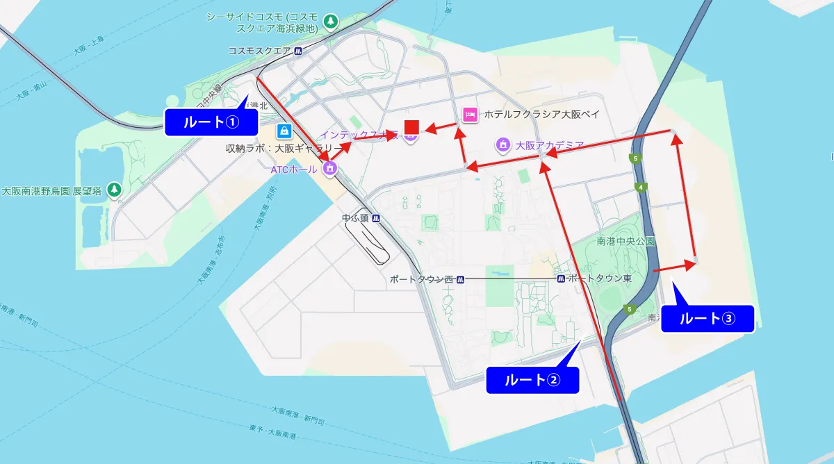 | ルート①: | 大阪港咲州トンネル・夢咲トンネルからのルートは、大阪咲州庁舎前のT字交差点信号を左折し、ミズノクリスタルビルを左手にとり、次の信号を右方向へ直進し100m先の正門より左折入場 テクノ・ラボ大阪の玄関から右手に進み奥の研究棟まで進む |